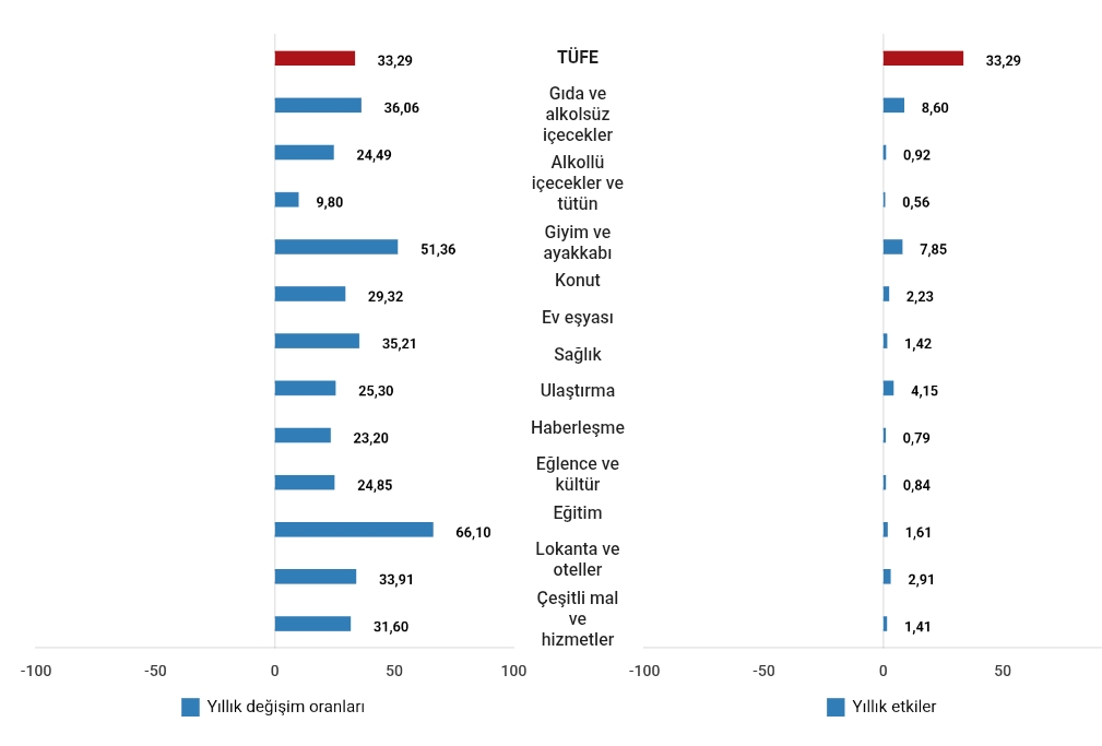 TÜFE ana harcama gruplarının yıllık değişim oranları ve genel endeks değişimine etkileri(%), Eylül 2025