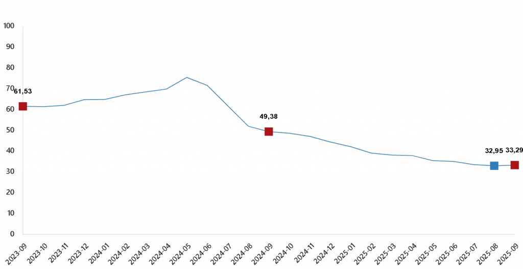Türkiye’de Eylül ayında bir önceki aya göre %3,23 artış, bir önceki yılın Aralık ayına göre %25,43 artış, bir önceki yılın aynı ayına göre %33,29 artış ve on iki aylık ortalamalara göre %38,36 artış olarak gerçekleşti. Türkiye’de 2025 Ekim Ayında işyeri ve konutlar için %38,36 oranında kira artışı uygulanacak.