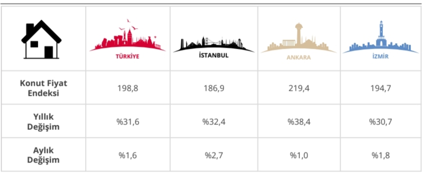 2025 yılı Ekim ayında, İstanbul, Ankara ve İzmir’de bir önceki aya göre, sırasıyla yüzde 2,7, 1,0 ve 1,8 oranlarında artış gözlenmiştir. Endeks değerleri bir önceki yılın aynı ayına göre, İstanbul, Ankara ve İzmir’de sırasıyla yüzde 32,4, 38,4 ve 30,7 oranlarında artış göstermiştir.