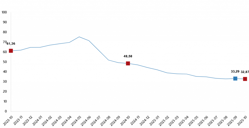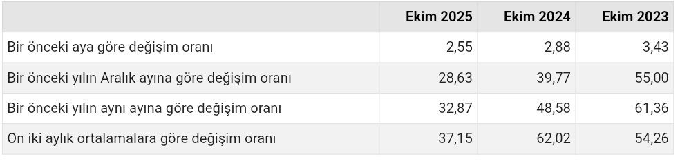 2025 yılı Ekim ayında bir önceki aya göre %2,55 artış, bir önceki yılın Aralık ayına göre %28,63 artış, bir önceki yılın aynı ayına göre % 32,87 artış ve on iki aylık ortalamalara göre % 37,15 artış olarak gerçekleşti. Türkiye’de 2025 Kasım Ayında işyeri ve konutlar için % 32,15 oranında kira artışı uygulanacak.