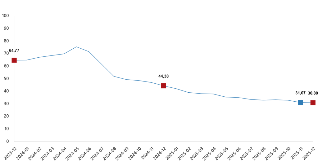 2025 yılı Aralık ayında bir önceki aya göre %0,89 artış, bir önceki yılın Aralık ayına göre %30,89 artış, bir önceki yılın aynı ayına göre %30,89 artış ve on iki aylık ortalamalara göre %34,88 artış olarak gerçekleşti. Türkiye’de Aralık Ayında konut ve işyerleri için % 34,88 oranında kira artışı uygulanacak.